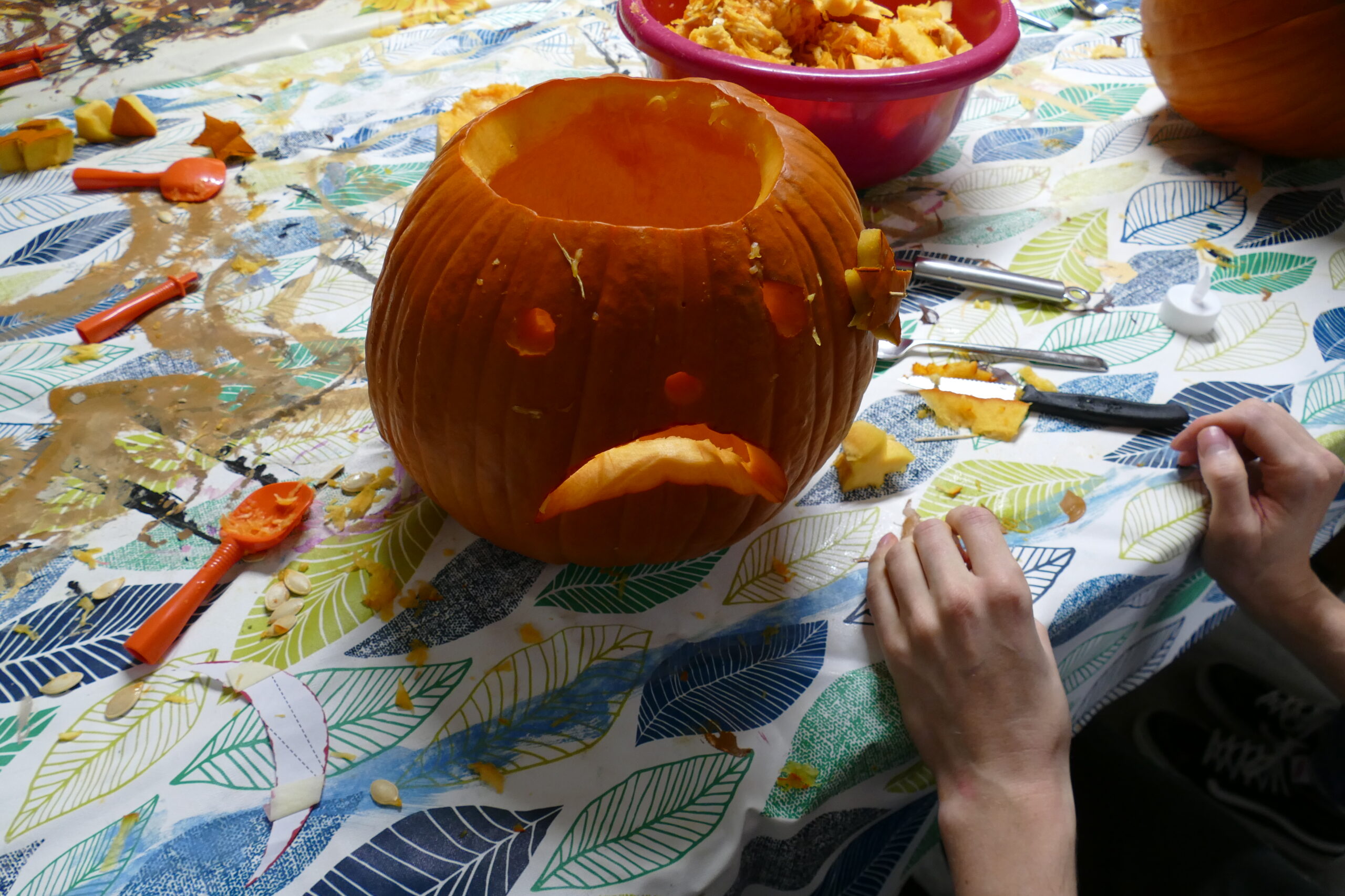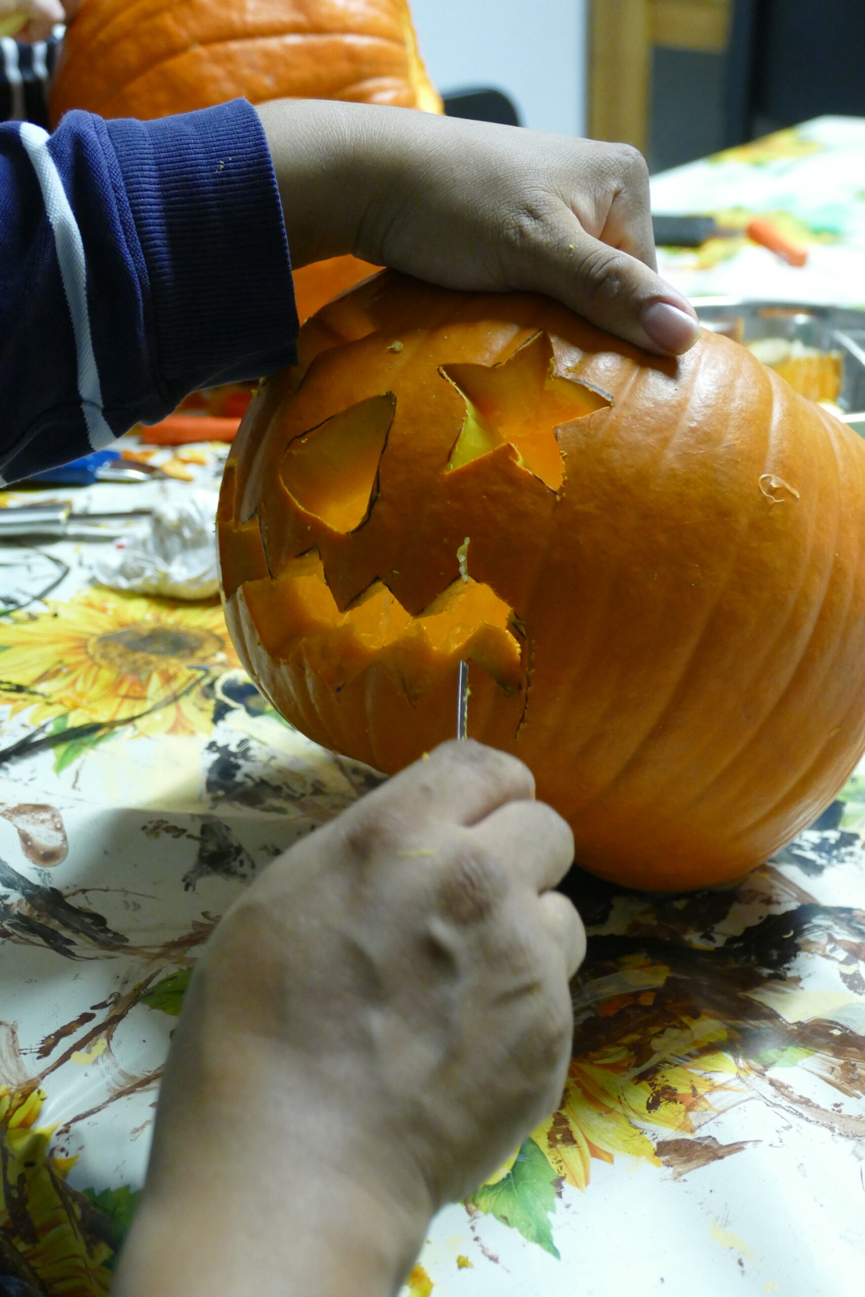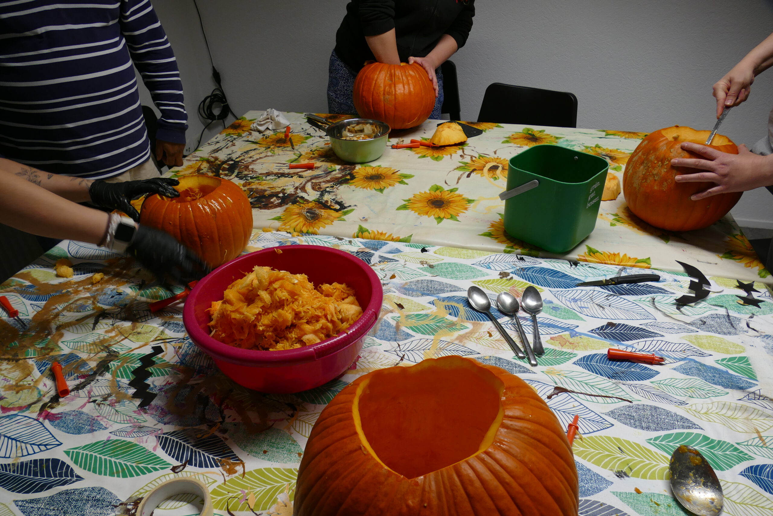 Im Rahmen des Kochabends haben einige Leistungsnutzende ihre kreativen und ziemlich ausgefallenen Ideen umgesetzt. So entstanden richtig coole, kunstvolle und teilweise ganz schön gruselige Kürbisse für die Halloween-Nacht.